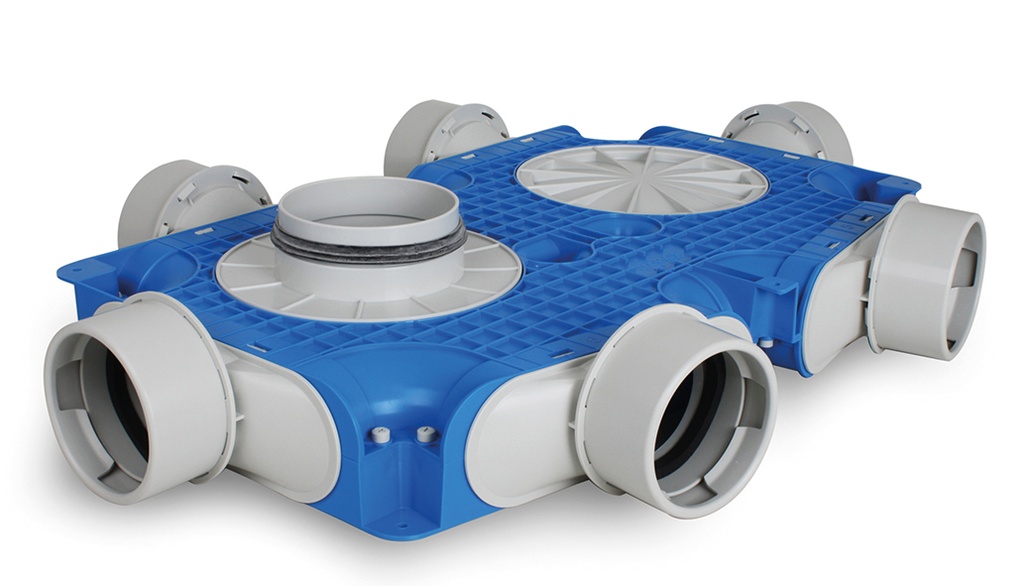 De verdeelcollectoren verdelen de lucht van en naar de ruimtes, en zijn geschikt voor zowel toevoer als afvoer. De collector wordt aangesloten op de unit of hoofdleiding met starre of flexibele luchtkanalen. Verder zijn de zijdelinkse Uniflexplus+ aansluitingen beschikbaar voor verdeling van lucht van of naar de eindcollectoren.